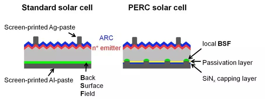 中國的光伏五年計(jì)劃將 PERC(passivated emitter rear contact,鈍化發(fā)射極背面接觸)電池列為重點(diǎn)支持的光伏技術(shù)。與標(biāo)準(zhǔn)光伏電池相比,PERC 電池的結(jié)構(gòu)略微不同,并在電池背面包含一層絕緣材料(如氧化鋁)。這有助于將未吸收的光反射回半導(dǎo)體,從而提高電池的整體效率。