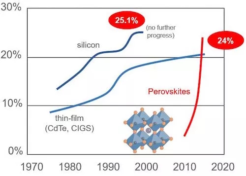 以硅為基礎(chǔ)材料的光伏電池的迅速增長,也可能會(huì)帶來不利影響。對(duì)硅電池生產(chǎn)線的巨大投資可能會(huì)擠占更為資源集約型的薄膜光伏技術(shù)(如碲化鎘)的市場地位。但另一種新興薄膜技術(shù)的出現(xiàn)可能會(huì)避免該問題,這就是鈣鈦礦太陽能電池——其在過去十年中取得了飛速的發(fā)展,效率從 2009 年時(shí)的約 4% 上升到 2017 年時(shí)的 22% 以上。