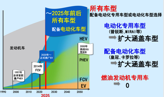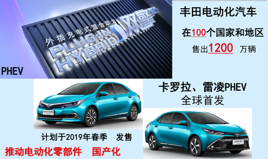 2019年豐田在華引入國產(chǎn)PHEV插電式混動卡羅拉/雷凌已經(jīng)是板上釘釘,在電動化戰(zhàn)略中,計劃到2020年左右,陸續(xù)在全球推出10余款純電動汽車;到2025年,旗下所有車型欲將導(dǎo)入電動化專用車型或增加電動化車型選擇,傳統(tǒng)單純的燃油發(fā)動機(jī)將退出歷史舞臺。