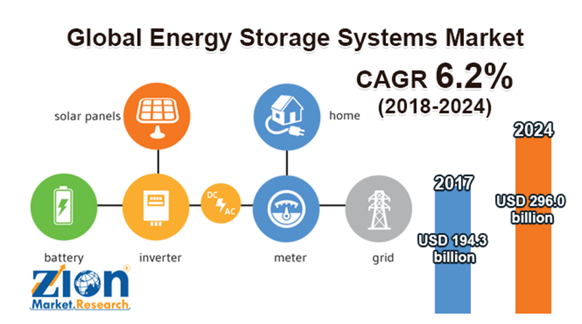中國儲能網(wǎng)訊:根據(jù)錫安市場研究(Zion Market Research)公司的一份最新的調(diào)查報告,2017年全球儲能系統(tǒng)市場收入約為1943億美元,預(yù)計到2024年底將產(chǎn)生約2960億美元的收入,2018年到2024年的復(fù)合年增長率約為6.2%。