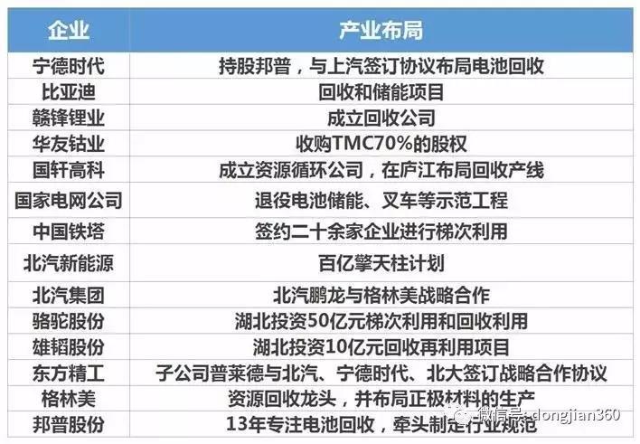 7月工信部公布的第一批動力電池試點企業(yè)名單,從中央到地方綜合推進動力電池規(guī)范化的回收。從下表不難發(fā)現(xiàn),這幾家動力電池企業(yè)都是新能源汽車主要的電池材料供應商,具備專業(yè)的設備和人才進行廢舊電池材料的處理能力。