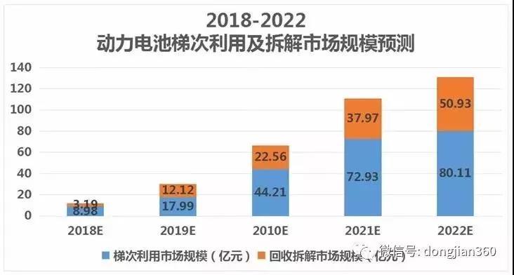 2018年為動力電池回收再利用元年,2020年為動力電池回收再利用爆發(fā)年。伴隨著動力電池報廢量的不斷增長,未來十年電池回收很可能達到百億美元的市場份額。目前動力電池回收后的方向主要是梯次利用及拆解,基于現(xiàn)在的金屬回收價格以及技術情況,磷酸鐵鋰電池回收之后梯次利用應用廣而三元電池回收之后更多的是報廢拆解。