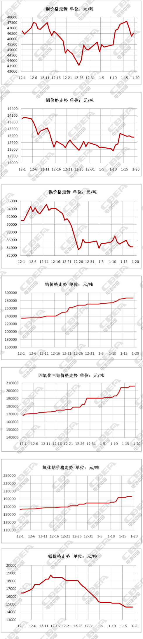 本周海外大盤鈷價(jià)再創(chuàng)新高,高純度鈷價(jià)已漲至15.45-16.15美元/磅,中國(guó)鈷報(bào)價(jià)也隨之上漲;但下游消費(fèi)未見回溫,目前市場(chǎng)主要消費(fèi)群體多為囤貨商,為造勢(shì)拉動(dòng)價(jià)格。截止本周五,電解鈷主流價(jià)格在29-30.5萬元/噸,均價(jià)較上周上漲1.3萬元/噸,在上周漲幅稍顯平穩(wěn)后本周投機(jī)商控盤推升,中國(guó)鈷價(jià)已高于海外價(jià)格,在市場(chǎng)需求支撐不強(qiáng)的情況下,應(yīng)當(dāng)充分考慮資本炒作因素,后市仍要關(guān)注資本市場(chǎng)動(dòng)態(tài)及春節(jié)后中國(guó)市場(chǎng)的實(shí)際需求,預(yù)計(jì)近期鈷市繼續(xù)維持上漲態(tài)勢(shì)。
