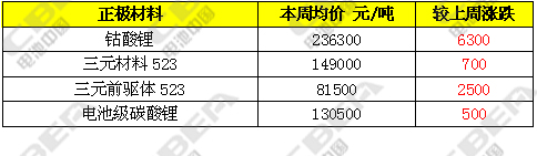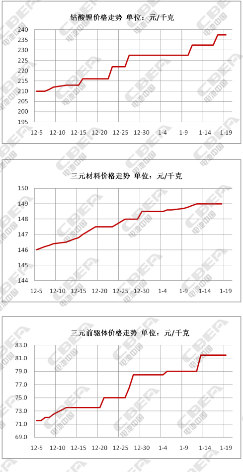 本周鈷酸鋰、三元材料及碳酸鋰價(jià)格整體呈現(xiàn)上漲態(tài)勢(shì),主要是由于近期原料市場(chǎng)成本加速上漲,生產(chǎn)廠家成本增加,迫使廠家不得不上調(diào)報(bào)價(jià),但下游采購(gòu)商對(duì)高報(bào)價(jià)持觀望態(tài)度,致使整體成交情況一般,近期多以交付前期訂單為主。目前,鈷酸鋰市場(chǎng)主流價(jià)格在23.5-24萬元/噸,均價(jià)較上周上漲6300元/噸;三元材料價(jià)格本周上漲700元/噸,市場(chǎng)主流報(bào)價(jià)在14.5-15.3萬元/噸;三元前驅(qū)體本周報(bào)價(jià)在8-8.3萬元/噸,均價(jià)較上周上漲2500元/噸;市場(chǎng)上新單成交放量有限,部分生產(chǎn)商基本已進(jìn)入春節(jié)前檢修期。