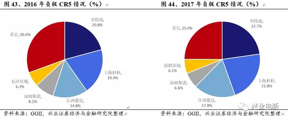 負(fù)極市場的馬太效應(yīng)是四大材料中最為明顯的,龍頭格局穩(wěn)固,CR5與CR3的市場占有率不斷提升。從下圖可以看出,2016年負(fù)極CR5占據(jù)約70%市場份額,2017年提升至約75%,同時(shí)市場份額進(jìn)一步由CR5向CR3聚攏,前三差距減小。2017年CR3占比高達(dá)約60%,第一梯隊(duì)地位鞏固,難以撼動(dòng)。