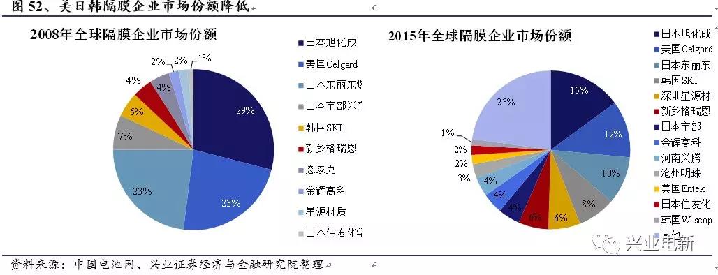 同時(shí),近年來,國內(nèi)鋰電隔膜供應(yīng)商逐步進(jìn)入海外市場,美日韓隔膜企業(yè)的市場份額下降明顯。2008年,美國、日本和韓國濕法隔膜企業(yè)市場份額合計(jì)達(dá)到88%,占據(jù)行業(yè)主導(dǎo)地位;而2015年,這一比例下降至54%,中國鋰電隔膜企業(yè)在國際市場中的份額提升顯著。