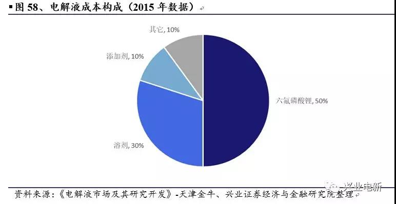 電解液是鋰離子電池中起到鋰離子傳輸?shù)拿浇榈淖饔?,具有較高的離子電導(dǎo)率與極好的電子絕緣性,在電芯中的成本占比約為6-10%。當(dāng)前主要使用的電解液由三部分組成,有機(jī)溶劑,溶質(zhì)六氟磷酸鋰(LiPF6)以及添加劑。電解液中溶質(zhì)與溶劑的配比一般為1:6.5左右:一噸電解液中一般含有0.13噸的LiPF6與0.85噸的溶劑。電解液的成本主要因素為LiPF6,成本占比超過40%,溶劑成本雖有波動(dòng),但整體影響并不大,添加劑價(jià)格穩(wěn)定,成本由用量決定。