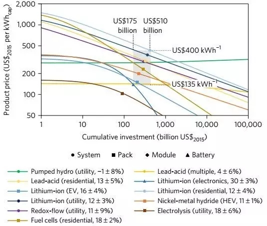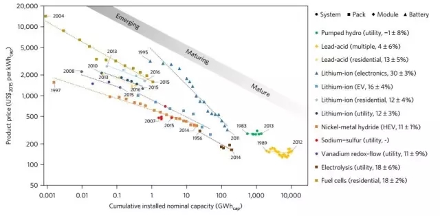 有鑒于此,帝國理工學(xué)院O. Schmidt等人根據(jù)現(xiàn)有的數(shù)據(jù)和經(jīng)驗曲線,對11種電能存儲技術(shù)的未來成本進(jìn)行了分析。