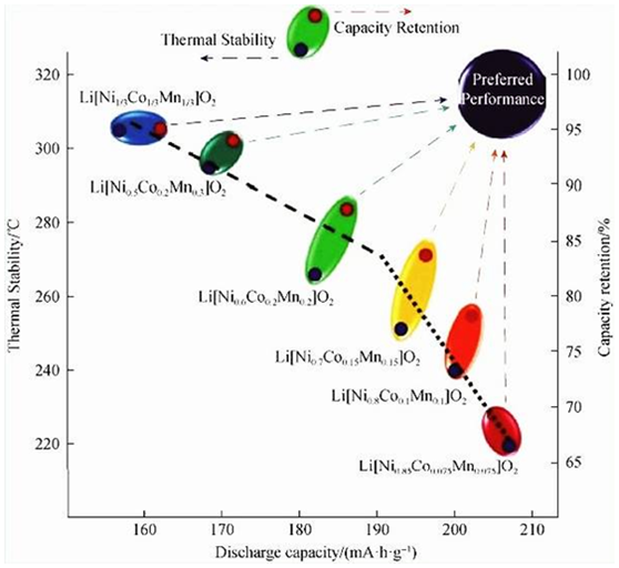 三元電池中,按照鎳、鈷、錳三者用量比例,具體可細分為111型、523型、622型和811型等。一般來說,高鎳的三元正極材料是指材料中鎳的摩爾分數(shù)大于0.6的材料,這樣的三元材料具有高比容量和低成本的特點。
