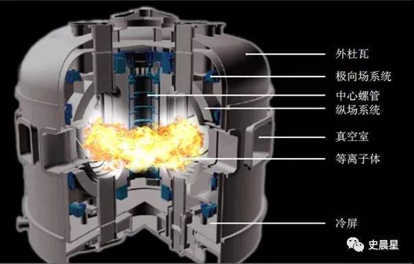 技術(shù)原理:核聚變反應(yīng)堆原理是使用超高溫度將氫的同位素氘和氚加熱成等離子體,然后依靠二者的高速碰撞生產(chǎn)氦,在這一反應(yīng)中會(huì)發(fā)生質(zhì)量損失,而損失掉的質(zhì)量就由質(zhì)能方程E=mc2轉(zhuǎn)化成了巨額能量。為了束縛住反應(yīng)堆中的超高溫等離子體,需要制造一個(gè)環(huán)形磁場,托卡馬克“環(huán)”因此得名。