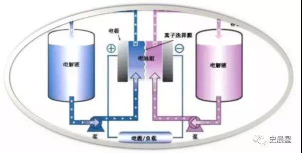 技術(shù)原理:液流電池的核心結(jié)構(gòu)是被分離存儲(chǔ)的正負(fù)極電解液以及用于正負(fù)極電解液進(jìn)行反應(yīng)的電堆。在循環(huán)泵的推動(dòng)下,正負(fù)極電解液流經(jīng)電堆處并發(fā)生反應(yīng),從而將化學(xué)能轉(zhuǎn)化成電能。目前最常見的液流電池為全釩液流電池。