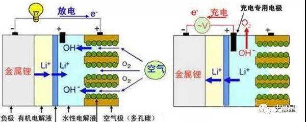 技術(shù)原理:以純氧氣為正極,以金屬鋰/鋁為負(fù)極,放電及充電時(shí)分別發(fā)生金屬鋰的氧化及還原反應(yīng),具有高達(dá)11500Wh/kg的理論能量密度