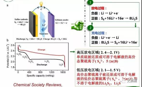 技術(shù)原理:單質(zhì)硫完全得電子后的克容量高達(dá)1675mAh/g,以金屬鋰做電極的能量密度高達(dá)3860mAh/g,將二者結(jié)合:正極為硫單質(zhì)、負(fù)極為金屬鋰,就形成了鋰硫電池。其充放電進(jìn)行的是金屬鋰與硫的氧化與還原反應(yīng)。