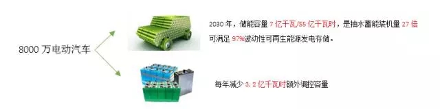 一是車載電池,按照2030年全國電動汽車保有量達(dá)到8000萬輛的預(yù)測,電動汽車每年充電需求將達(dá)到4100億千瓦時,理論儲能容量達(dá)到7億千瓦/55億千瓦時,其功率儲能的容量約為目前全國抽水蓄能裝機量的27倍。2030年風(fēng)電,光伏發(fā)電電量將達(dá)到42.1億千瓦時,則僅電動乘用車的有效儲能容量即可滿足97%波動性可再生能源日發(fā)電量的存儲,如果電動汽車能夠有序充放電,則可以減少額外投資而獲得的巨大調(diào)控容量。