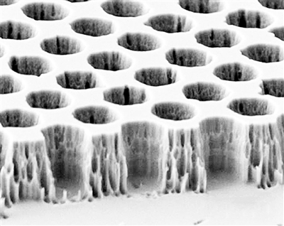 正是這些直徑僅為3/4微米、深為3微米、分開排列在一個(gè)4/5微米寬的網(wǎng)格中的凹洞發(fā)揮了捕獲光線的作用。當(dāng)設(shè)備對齊使得凹洞直指太陽時(shí),大部分入射光會(huì)穿過這些凹洞進(jìn)入底部,在此處被鎢吸收。就像熱力學(xué)定律指出的那樣,這些光線旋即會(huì)釋放出來并輻射出去。然而,來自于一個(gè)凹洞內(nèi)部的熱輻射在逃入外面的世界時(shí),很可能會(huì)遇到凹洞的壁。如此一來,整個(gè)吸收和再輻射過程又再次發(fā)生,結(jié)果會(huì)使凹洞的鎢變得非常熱。