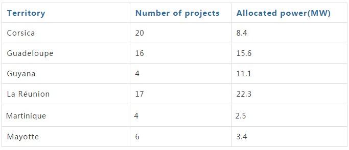 在法屬群島上可以清楚地看到這一點(diǎn),在科西嘉島、瓜德羅普島和馬提尼克島等領(lǐng)土上的太陽能儲(chǔ)能項(xiàng)目招標(biāo)時(shí),中標(biāo)者在2017年8月宣布,通常比以前的逆向拍賣低40%。包括光伏板和電池共計(jì)63.3MW的67個(gè)項(xiàng)目獲得了保證的購(gòu)買價(jià)格,其發(fā)電功率為每MWh 113.6歐元(133.97美元)(表1)。