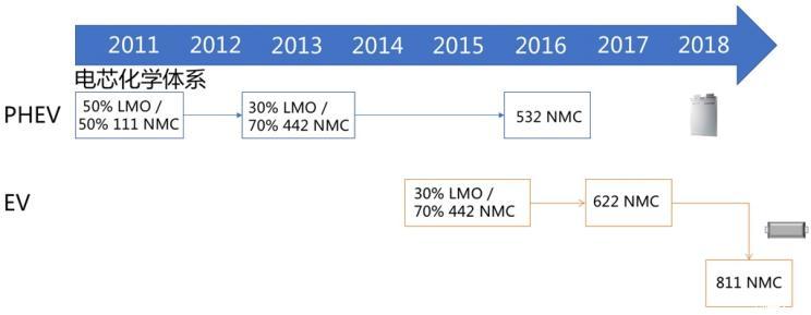 動(dòng)力電池從磷酸鐵鋰往三元鋰路線的轉(zhuǎn)移并不是一蹴而就,如下圖所示,在國內(nèi)快速轉(zhuǎn)化之前,國外電池企業(yè)已經(jīng)在電芯化學(xué)體系上做了一些變革。之所以給我們“忽如一夜春風(fēng)來”的感覺,主要還是我們在磷酸鐵鋰的路線上堅(jiān)持了比較長的時(shí)間。當(dāng)2016年以后普遍轉(zhuǎn)向三元鋰電芯開發(fā),一下子跟上了日韓的技術(shù)路徑。
