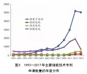 圖5為1993-2017年主要儲(chǔ)能關(guān)鍵技術(shù)專利申請(qǐng)數(shù)量年度變化圖,如圖所示,進(jìn)入21世紀(jì)之前,鉛酸電池技術(shù)的專利產(chǎn)出明顯高于其他三種儲(chǔ)能技術(shù),直到2003年被鋰離子電池超越。從年度專利變化來看,鋰離子電池的專利產(chǎn)出在2008年后開始大幅增長(zhǎng),專利數(shù)量遙遙領(lǐng)先其他電池技術(shù),成為最熱儲(chǔ)能技術(shù)。
