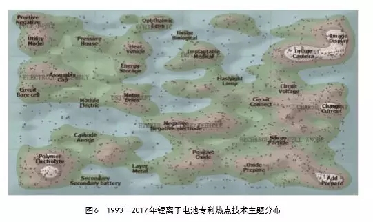 利用ThomsonInnovation平臺(tái)的專利地圖功能,結(jié)合專利分類號(hào)的分析,我們對(duì)鋰離子電池、鈉硫電池、液流電池及鉛酸電池專利技術(shù)熱點(diǎn)進(jìn)行了分析。圖6為鋰離子電池的專利熱點(diǎn)技術(shù)地圖,可以看出,鋰離子電池專利的熱點(diǎn)技術(shù)主題包括:(1)聚合物電解質(zhì);(2)正極、負(fù)極氧化物材料研究;(3)儲(chǔ)能、電動(dòng)汽車及圖像處理技術(shù)應(yīng)用;(4)充放電研究;
