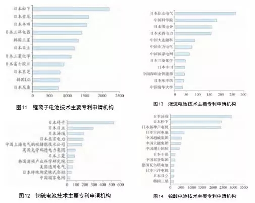 儲(chǔ)能關(guān)鍵技術(shù)領(lǐng)域,日本企業(yè)具有較大領(lǐng)先優(yōu)勢(shì)。鋰離子電池領(lǐng)域,松下、索尼、豐田和三洋排名前四位(圖11所示);鈉硫電池領(lǐng)域,礙子(NGK)、日立、湯淺、東京電力排名前4位,中國(guó)上海電氣鈉硫儲(chǔ)能技術(shù)公司排名第5位(圖12所示);液流電池領(lǐng)域,日本住友、中國(guó)科學(xué)院、日本明電舍、日本關(guān)西電力、中國(guó)大連融科排名前5位(圖13所示);鉛酸電池領(lǐng)域,日本湯淺、松下、新神戶和古河電池專利申請(qǐng)量排名前4位,中國(guó)超威、天能、理士國(guó)際排名5-7位(圖14所示)。