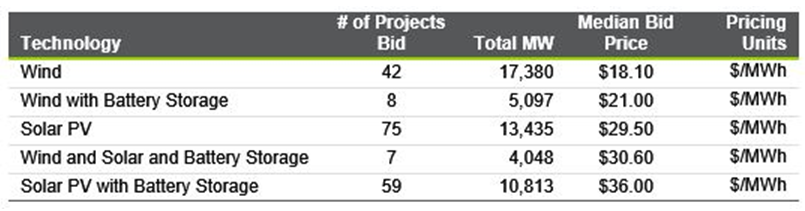 科羅拉多州儲(chǔ)能市場(chǎng)最值得關(guān)注的發(fā)展是來自該州最大的電力供應(yīng)商Xcel Energy公司日前公布的項(xiàng)目,該公司實(shí)施了新的太陽能、風(fēng)能和儲(chǔ)能容量的投標(biāo)。通過全方位的招標(biāo),Xcel公司收到了一些項(xiàng)目的投標(biāo)報(bào)價(jià),這些項(xiàng)目提供了風(fēng)電、風(fēng)能+電池儲(chǔ)能、太陽能、太陽能+電池儲(chǔ)能,以及三種資源結(jié)合在一個(gè)項(xiàng)目中的最低價(jià)格。下表顯示了總出價(jià)和收到的平均價(jià)格。