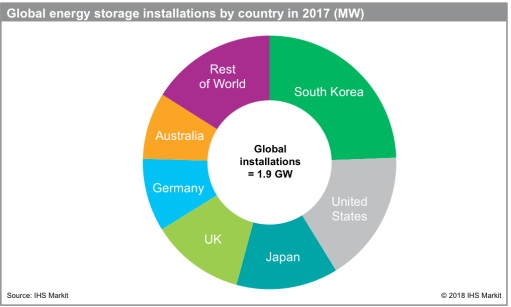 與調(diào)研機(jī)構(gòu)GTM Research公司最近發(fā)布的2017年報(bào)告不同,HIS公司去年將韓國而不是美國認(rèn)定為儲(chǔ)能部署最多的國家級(jí)市場(chǎng)之一。下圖顯示了HIS公司如何細(xì)分全球儲(chǔ)能部署的市場(chǎng)份額。