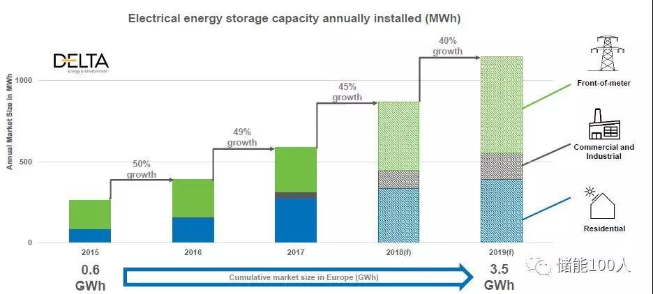 根據歐洲儲能協(xié)會最新發(fā)布的《歐洲儲能市場檢測報告》顯示,2017年歐洲電力儲能設備裝機容量接近600MWH,相比于2016年的400MWH,增速高達49%。其中,工商業(yè)儲能和戶用儲能增速明顯高于電網端儲能,成為增長的主力軍。