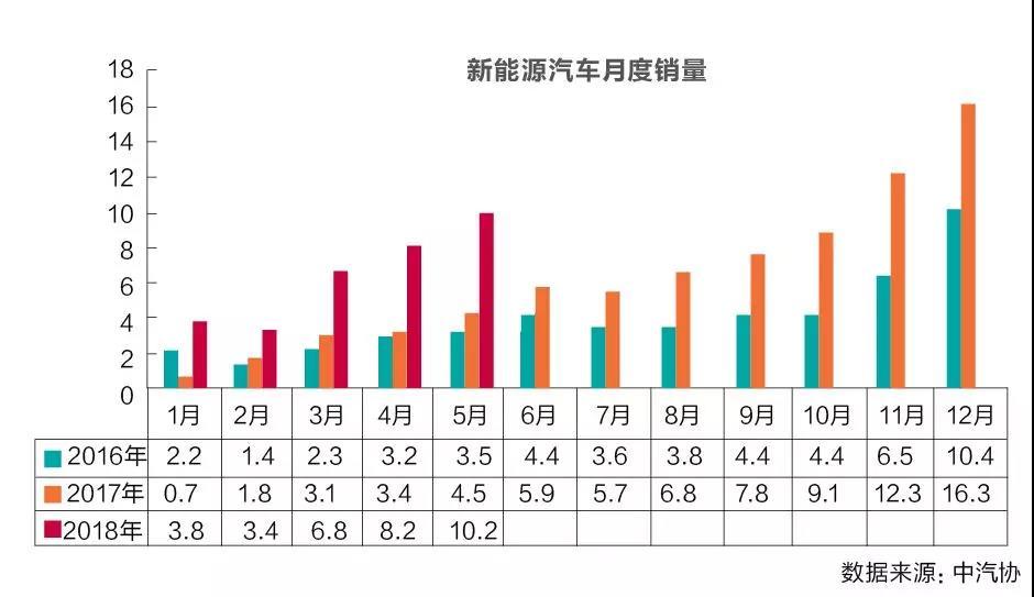 根據(jù)中汽協(xié)最新發(fā)布的產(chǎn)銷(xiāo)數(shù)據(jù),2018年5月,我國(guó)新能源汽車(chē)產(chǎn)銷(xiāo)分別完成9.6萬(wàn)輛和10.2萬(wàn)輛,比上年同期分別增長(zhǎng)85.6%和125.6%;1-5月,產(chǎn)銷(xiāo)均完成32.8萬(wàn)輛,比上年同期分別增長(zhǎng)122.9%和141.6%。