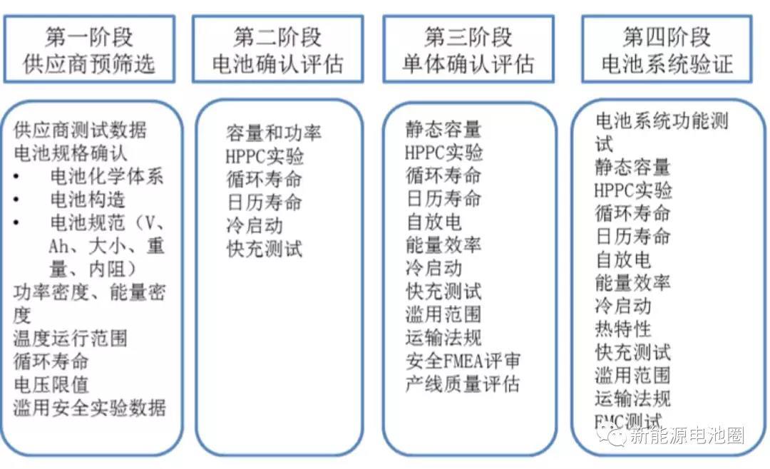 上汽集團共把它分為四個階段:預篩選-電池確認和評估-單體確認和評估-系統(tǒng)驗證。各個階段都有嚴格的測試流程和控制。