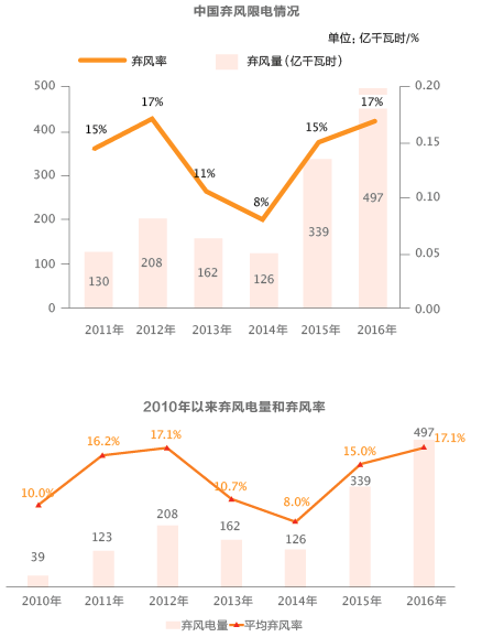 棄風(fēng)限電是我國(guó)風(fēng)電行業(yè)難以克服的一塊沉疴舊疾,也是一直困擾我國(guó)風(fēng)電發(fā)展的核心問題。2015年,我國(guó)棄風(fēng)限電問題反彈,并有進(jìn)一步惡化之勢(shì)。數(shù)據(jù)顯示,2016年全年風(fēng)電棄風(fēng)電量497億千瓦時(shí),同比增加158億千瓦時(shí);平均棄風(fēng)率17%,同比上升2個(gè)百分點(diǎn)。按平均電價(jià)0.5元/千瓦時(shí)計(jì)算,2016年損失電量收益近250億元。
