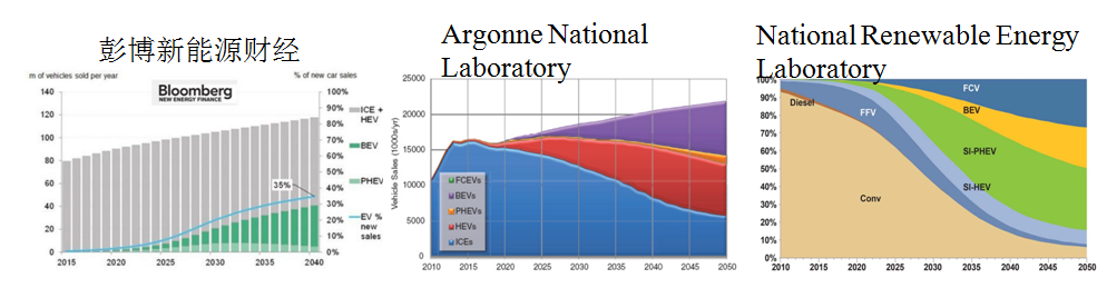 就這張圖來看,彭博新能源和阿貢能源實(shí)驗(yàn)室他們看好的還是電動(dòng)汽車技術(shù),右邊這張圖里面,美國國家可再生能源實(shí)驗(yàn)室更加看好的還是插電式混合動(dòng)力汽車和燃料混合動(dòng)力汽車。