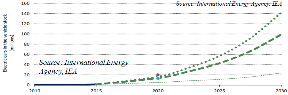 下面這張圖是國際能源署的預(yù)測,三種情形預(yù)測2030年全球汽車保有量,中間這張圖預(yù)測電動(dòng)汽車總量達(dá)到1億輛,這樣的預(yù)測跟中國目前國內(nèi)的研究機(jī)構(gòu)包括政府部門的判斷來講,這種預(yù)測就可能是偏保守的預(yù)測了。