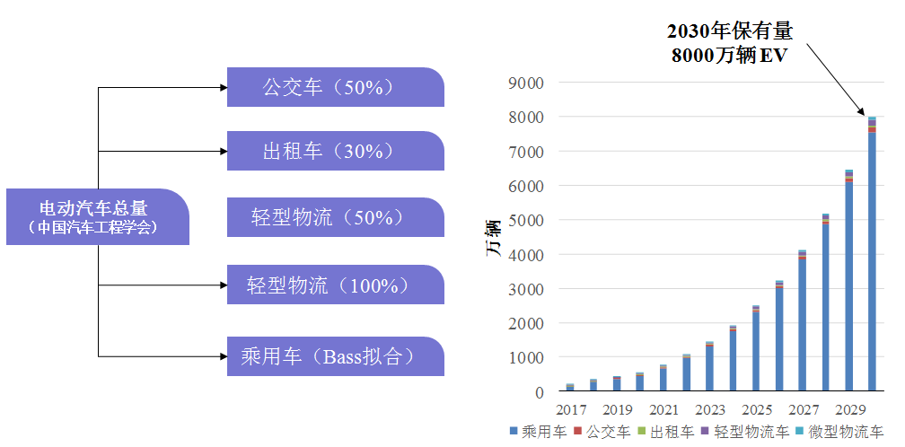 首先是車輛數(shù)的情況。我們這里采用的一個(gè)總量的數(shù)據(jù)是中國汽車工程學(xué)會(huì)做的《節(jié)能與新能源汽車發(fā)展路線圖》,他預(yù)測2030年全國電動(dòng)汽車總的保有量達(dá)到8千萬輛以上,我們就此對(duì)這個(gè)總量進(jìn)行了拆分,左邊這張表里面不同的車型后面的百分比就是我們認(rèn)為它到2030年之后電動(dòng)汽車技術(shù)在這類車型中的滲透率情況。右邊這張圖是我們對(duì)2030年之前各類電動(dòng)汽車車型數(shù)量規(guī)模的預(yù)測,到2030年仍然是電動(dòng)乘用車的保有量是明顯占據(jù)絕對(duì)的主體。