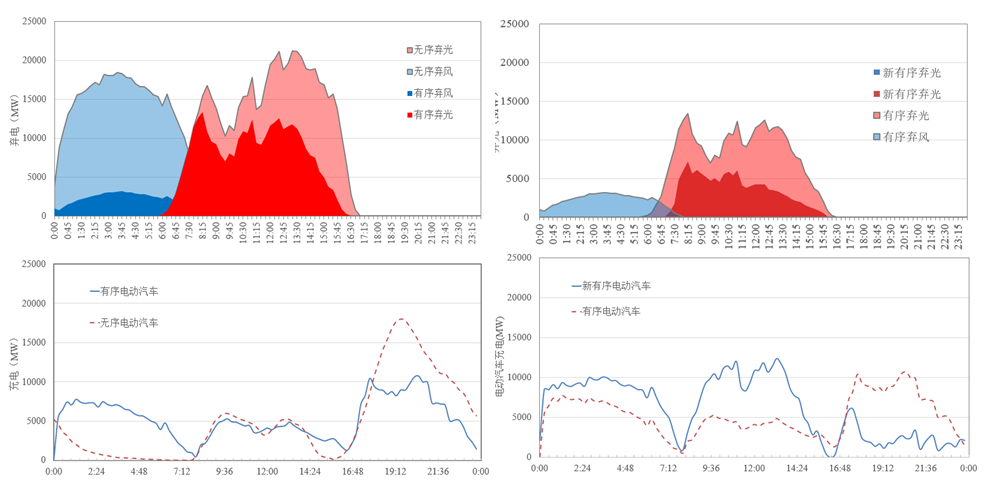 這張圖是我們對(duì)不同充電基礎(chǔ)設(shè)施情景下對(duì)電動(dòng)汽車系統(tǒng)價(jià)值的分析,左邊這張圖是以有序充電來看,電動(dòng)汽車減少棄風(fēng)棄光的效果,藍(lán)色和紅色部分分別是棄風(fēng)棄光一天之內(nèi)波動(dòng)的情況,電動(dòng)汽車采取有序充電之后,就把更多的傍晚時(shí)間充電負(fù)荷轉(zhuǎn)移到了凌晨,更多的幫助和消納凌晨時(shí)段可能棄掉的峰電。右邊這張圖釋放了白天充電的時(shí)間,因?yàn)樽筮呥@這張圖并沒有對(duì)白天公共地點(diǎn)的充電沒有設(shè)置很大的空間,右邊這張圖假設(shè)充電基礎(chǔ)設(shè)施不受限制,用戶可以自由在白天不同的充電基礎(chǔ)設(shè)施選擇他的充電地點(diǎn)之后,右邊這張圖可以更明顯的看到,在左邊這張圖基礎(chǔ)上有更多的傍晚時(shí)段的充電負(fù)荷轉(zhuǎn)移到了日間時(shí)段,就是說幫助消納了白天午間時(shí)段太陽能發(fā)電的效果。