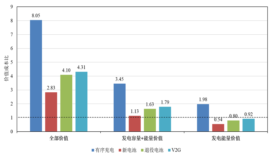 但是我們在最左邊這個(gè)部分,這四個(gè)柱狀圖里邊,我們包括了電動(dòng)汽車也好、儲(chǔ)能也好,各類價(jià)值的總和,實(shí)際上我們知道,其實(shí)對(duì)比容量價(jià)值、能量價(jià)值的時(shí)候,容量價(jià)值是存在不確定性的,特別是中國目前是存在發(fā)電容量供大與求這樣的局面,所以到2030年之前是否還是這樣的情況存在一定的不確定性,因此我們在最右邊這個(gè)圖里邊也是對(duì)單純的發(fā)電能量價(jià)值進(jìn)行對(duì)比,如果我們完全不考慮容量價(jià)值之后,單純考慮發(fā)電側(cè),就是新能源發(fā)電廠和火電廠它的這部分獲取的價(jià)值之后,電動(dòng)汽車的價(jià)值,有序充電還是比較高的水平,其他的各類技術(shù)經(jīng)濟(jì)性就非常低了,是低于1的。