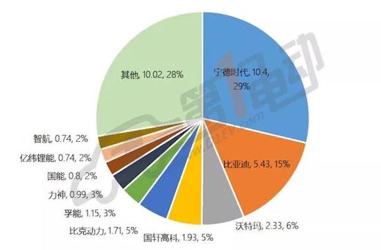 我們之前測經(jīng)測算過2017年國內(nèi)幾大動(dòng)力電池企業(yè)的產(chǎn)品裝機(jī)量,也就是實(shí)實(shí)在在裝在車上的電池量。從總量上看,比亞迪和寧德時(shí)代這兩家企業(yè)瓜分了全國約44%的市場份額。