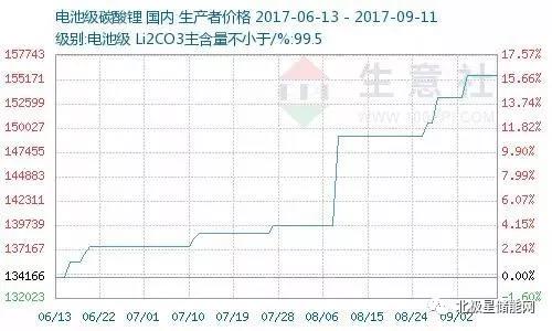 用于電池碳酸鋰的國內(nèi)生產(chǎn)商報價顯示,碳酸鋰過去三個月漲了15.66%。