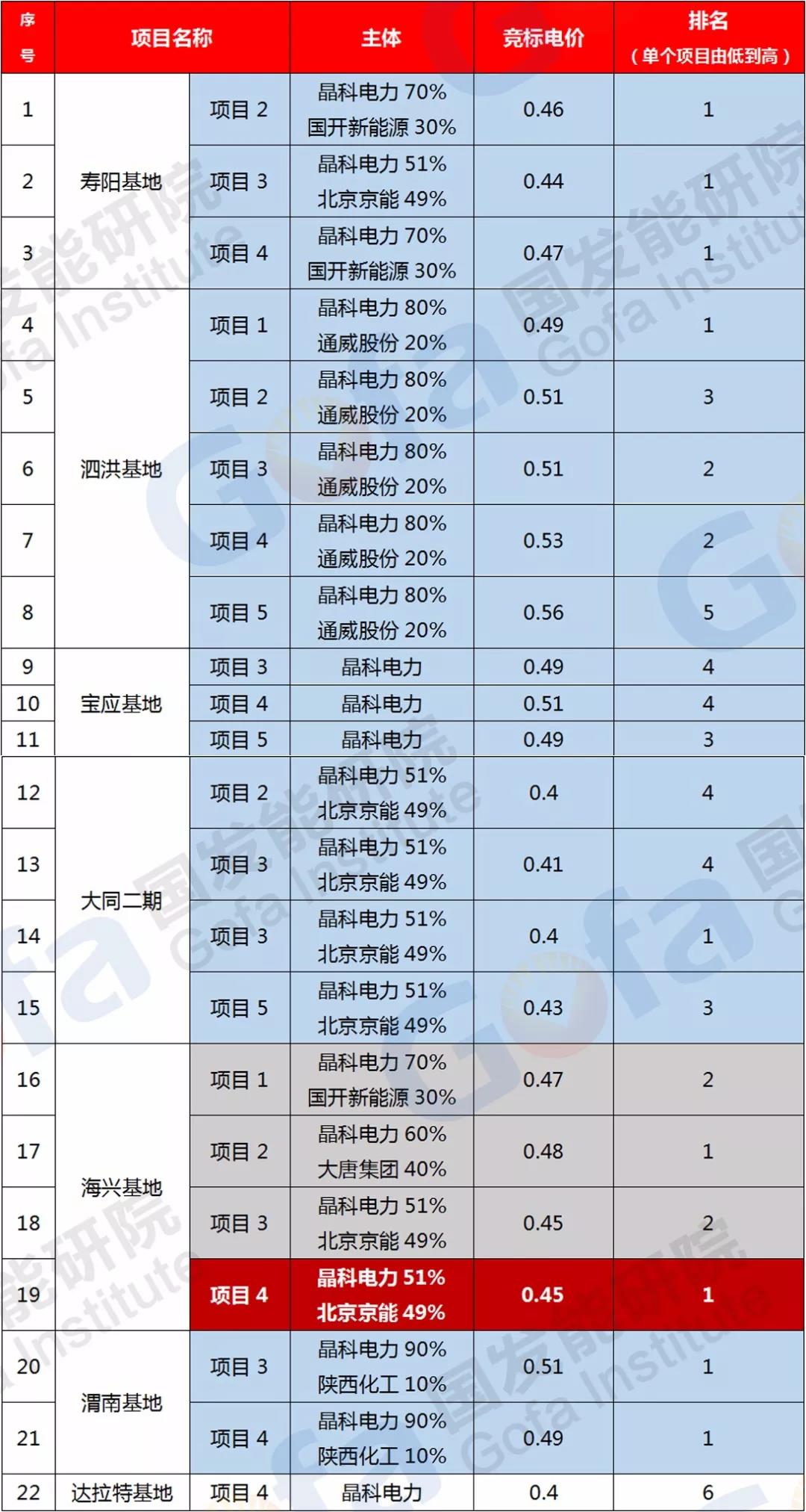 在單獨(dú)或聯(lián)合體參與投標(biāo)的幾個(gè)項(xiàng)目中,晶科電力擁有9個(gè)最低電價(jià)和4個(gè)次低電價(jià),競(jìng)標(biāo)電價(jià)基本都處于有利位置??梢钥闯?,晶科能源的競(jìng)標(biāo)報(bào)價(jià)相當(dāng)精準(zhǔn)。即規(guī)避了廢標(biāo)范圍,又最大限度的保證以較低電價(jià)拿到高分,如果不是評(píng)審組計(jì)算方法泄露,那就是晶科電力的精算水平太高了!