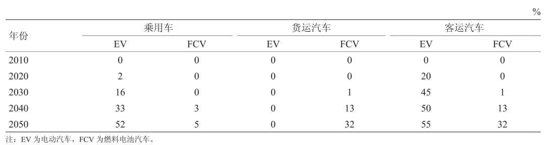 隨著新能源汽車技術(shù)進(jìn)步、成本下降及基礎(chǔ)設(shè)施的不斷完善,新能源汽車市場(chǎng)份額將快速增長,電動(dòng)汽車將逐步替代部分乘用車和大型客車,燃料電池汽車將逐步替代部分乘用車和部分大型客運(yùn)和貨運(yùn)汽車。如果新能源汽車得到大力發(fā)展,根據(jù)模型測(cè)算結(jié)果, 2020 年、 2030 年、 2050 年將可分別替代成品油 9.33 × 10^6 toe、 5.71 × 10^7 toe、 1.87 × 10^8 toe 左右。新能源汽車大力發(fā)展時(shí)的占比,如表 1 所示。