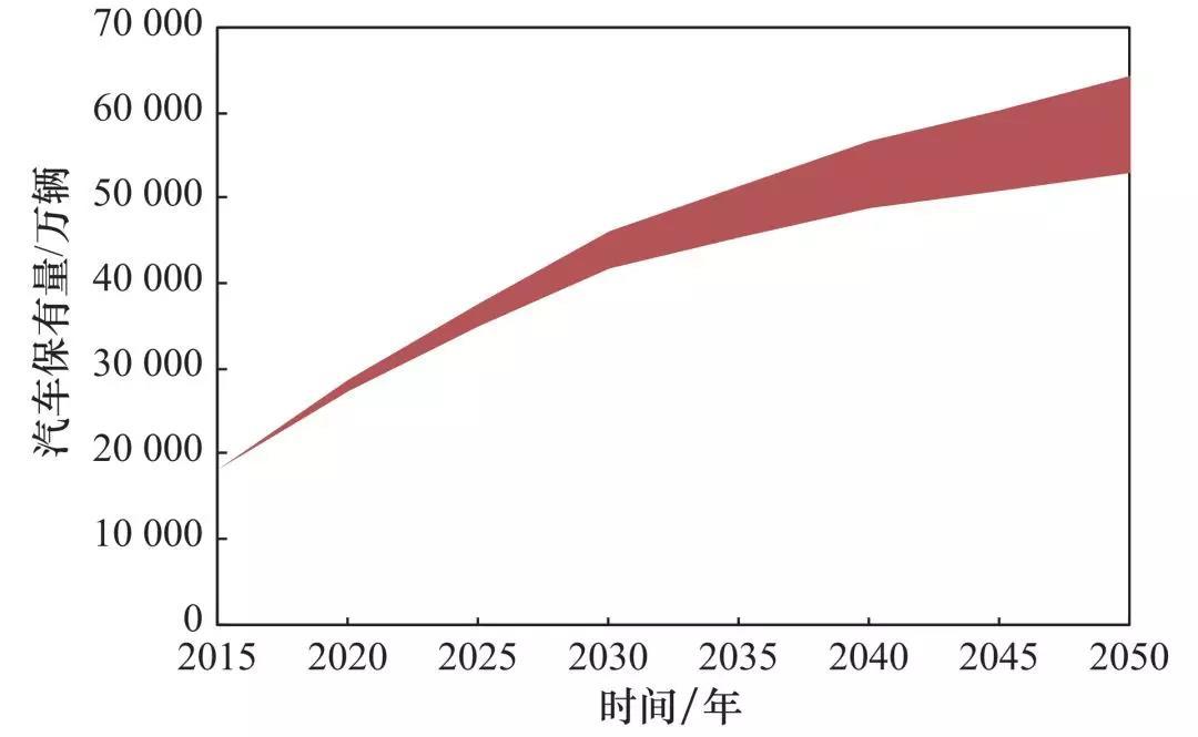 注:帶狀圖表示汽車保有量預(yù)測(cè)范圍,由于未來經(jīng)濟(jì)、人口和城鎮(zhèn)化率等驅(qū)動(dòng)因素的不確定性,未來汽車保有量的預(yù)測(cè)存在一定變動(dòng)范圍