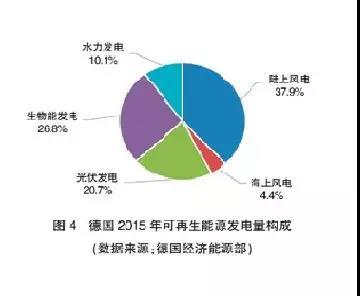 英、德自大規(guī)??稍偕茉粗С终邔嵤┮詠?,可再生能源快速發(fā)展。2002~2015年,英國可再生能源裝機容量從約300萬千瓦增加到3046萬千瓦,發(fā)電量占總發(fā)電量比例從2%左右增加到24.6%(見圖1),2015年可再生能源總發(fā)電量為835.5億千瓦時(具體各類可再生能源占比見圖2)。2000-2015年,德國可再生能源裝機容量從1820萬千瓦增加到9710萬千瓦,發(fā)電量占總發(fā)電量比例從6.2%增加到31.6%(見圖3),2015年可再生能源發(fā)電總量為1873.4億千瓦時(具體各類可再生能源占比見圖4)。兩國海上風(fēng)電全部接入輸電網(wǎng),而陸上風(fēng)電及其他可再生能源發(fā)電大多接入配電網(wǎng)。