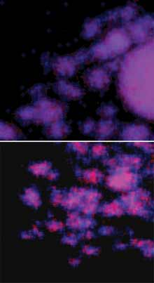 閃亮的殼:當(dāng)一個4納米的鉑銅合金納米粒(上)暴露在周期性的交流電中,銅原子從表面分離,生成一個富含鉑的殼。在掃描傳送式電子顯微鏡下,它的圖像更亮(下)。 來源:彼得•斯特拉瑟(Peter Strasser)
