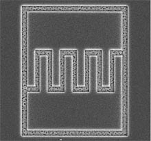 微型超級(jí)電容器:在顯微鏡中看到的這個(gè)薄膜碳超級(jí)電容器電極,大約每邊長(zhǎng)50微米。曲折多孔的地方是此裝置的活性區(qū)域。來源:閔憲