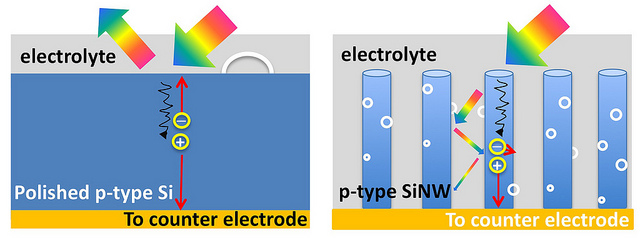 王德利的研究小組模仿這種結(jié)構(gòu),他們的“三維枝杈納米線陣列”(3D branched nanowire array)采用了一種工藝,稱為光電化學(xué)(photoelectrochemical)水解,可以產(chǎn)生氫氣。分解水所指的過程可以把水分離成氧和氫,提取氫氣作為燃料使用。這項(xiàng)工藝使用清潔能源,沒有溫室氣體副產(chǎn)品。相比之下,目前的傳統(tǒng)制氫方式依靠化石燃料供電。