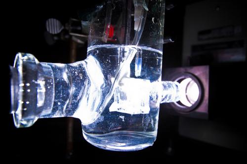 在這個(gè)實(shí)驗(yàn)中,納米樹電極浸在水中,用模擬太陽光照亮,可測量設(shè)備的電力輸出。來源:加州大學(xué)。