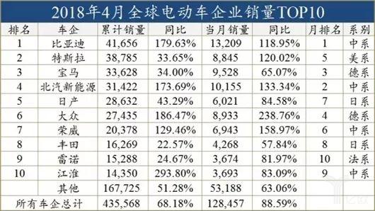 根據(jù)中汽協(xié)統(tǒng)計(jì),2018年4月,新能源汽車產(chǎn)銷分別完成8.1萬輛和8.2萬輛,比上年同期分別增長117.7%和138.4%。其中新能源乘用車銷量同比大漲135.8%至71,872輛。而海外機(jī)構(gòu)統(tǒng)計(jì)數(shù)據(jù)顯示,2018年4月份,全球電動乘用車(含純電動車與插電式混合動力車)銷量同比激增88.6%至12.8萬輛。也就是說,中國仍然占比超過50%。