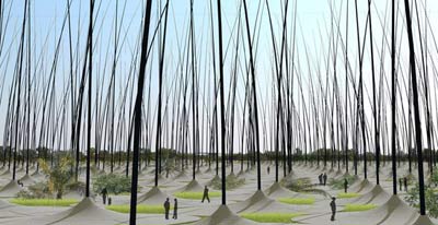 每個(gè)風(fēng)力莖桿頂端都有一個(gè)LED燈,當(dāng)風(fēng)流吹拂時(shí)就會(huì)發(fā)亮,當(dāng)處于強(qiáng)風(fēng)流狀態(tài)下將變得更加明亮。Atelier DNA公司預(yù)計(jì)風(fēng)力莖桿將表現(xiàn)得更加自然,在空中風(fēng)流吹拂下振動(dòng)。