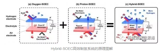 有鑒于此,他們開發(fā)出了全新的Hybrid-SOEC系統(tǒng),即借助一種混合離子導(dǎo)體、來同時(shí)傳輸負(fù)氧離子和帶電荷的氫離子(質(zhì)子),從而充分利用了固態(tài)電解槽的所有優(yōu)點(diǎn)、提升了制氫的效率。