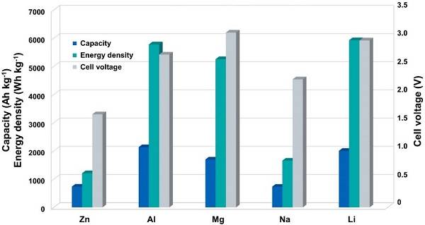 圖1 不同金屬空氣電池的容量、能量密度和電壓對比