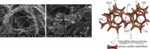 圖3 NiCo/PFC雙功能催化劑循環(huán)穩(wěn)定性結果、SEM圖及氣液固三相反應過程示意圖